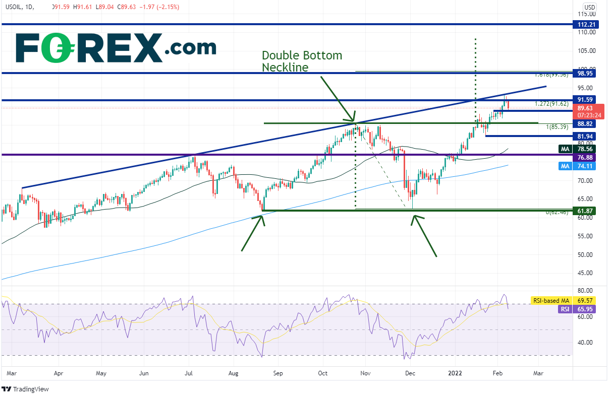 西得州原油自疫情爆发以来不断冲高,业已到达2014年9月以来最高点。油价上涨途中形成双底形态,第二个底形成于2021年12月2日,即61.87附近。上周最高触及93.14。双底形态的目标在颈线突破位加上双底低点到颈线的高度。本例中在108.30附近。油价会到达目标吗?