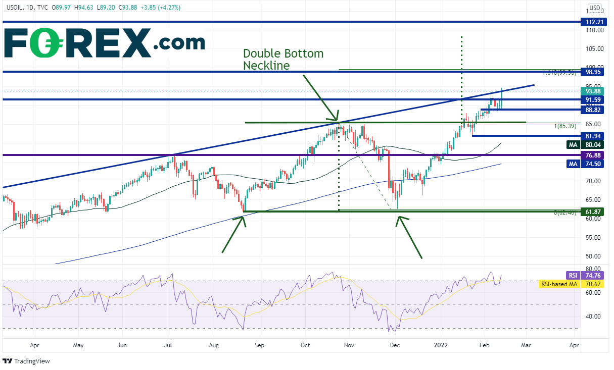 如上所述,西得州原油周五同样在俄罗斯方面的消息作用下自91.12走高至94.63,途中击穿长期上斜趋势线94.00附近。如果负面消息不断,油价可能上看98.95 - 99.56阻力区间,其由2014年以来的水平阻力位、2021年10月25日高点到12月2日低点行情的161.8%扩展位组成,以及100.00的心理整数关口。请注意,西得州油价于1月中旬打破了双底形态的颈线,目标指向108.10附近。